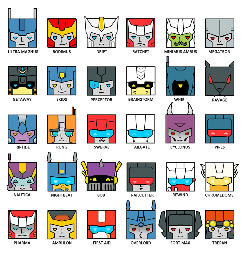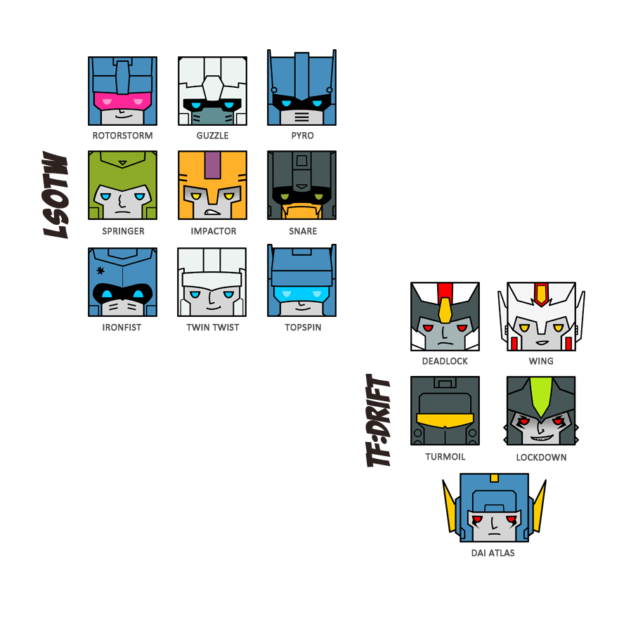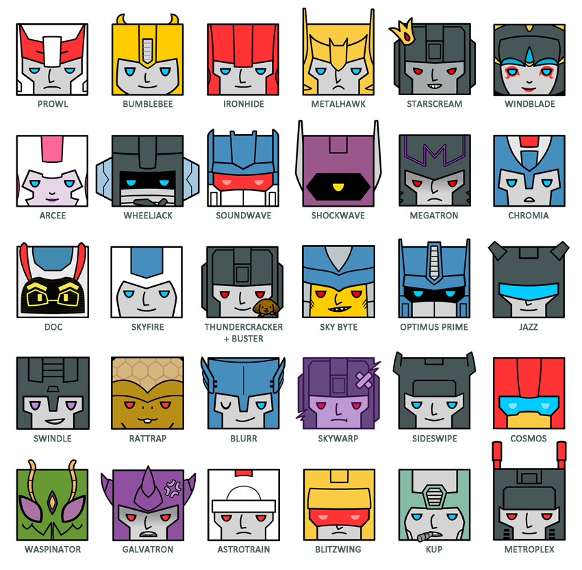 Astrotrain, Atomizer, Bee, Bluestreak, Blurr, Brainstorm, Chromedome, Chromia (Combiner Hunters), Crankcase, Cyclonus, Cyclonus (Shattered Glass), Getaway, Helex, Krok, Kup, Liege Maximo, Megatron, Minimus, Mirage, Nautica, Prowl, Pyro, Rewind, Shockwave, Skids, Springer, Starscream, Swerve, Tailgate, Tesarus, Thundercracker, Transmutate, Ultra Magnus