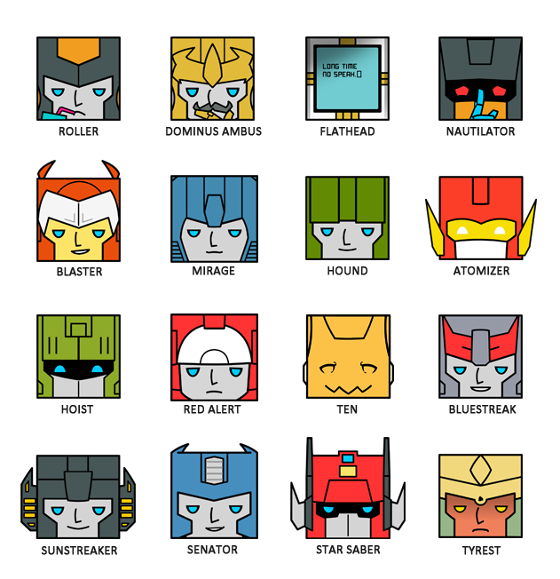 Airazor, Ambulon, Arcee TFP, Arcee, Bee RiD15, Bee TFA, Bee TFP, Blades, Blaster, Blitzwing TFA, Blurr TFA, Boulder, Brainstorm, Breakdown TFP, Bulkhead TFA, Chase, Chromia, Clampdown RiD15, Cliffjumper TFP, Cyclonus with broken horn, DOC, Dinobot, Drift with red markings, Fort Max, Fracture RiD15, Grimlock, Grimlock RiD15, Heatwave, Hoist, Inferno, Ironfist, Jazz, Jazz TFA, Kaon, Knockout, Lugnut, Megatron, Megatron BW, Megatron TFA, Megatron TFP, Minimus, Misfire, Optimus, Optimus Primal, Optimus TFA, Optimus TFP, Overlord, Perceptor, Pipes, Predaking TFP, Prowl TFA, Quark, Ratchet, Ratchet TFP, Red Alert, Rewind, Riptide, Rodimus, Rotorstorm, Rung, Senator, Shockwave, Sideswipe RiD15, Sixshot, Skybyte, Skywarp, Smokescreen TFP, Soundwave, Soundwave SG, Soundwave TFA, Soundwave TFP, Starscream TFP, Strongarm, Swindle, Thundercracker, Tailgate, Tarantulas, Tarn, Tesarus, Transmutate, Tyrest, Ultra Magnus TFP, Vos, Waspinator, Wheeljack, Wing